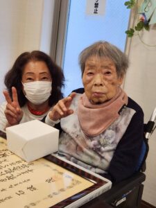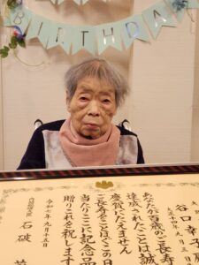 昨日は当施設にご入居されているT様に、内閣総理大臣の名代で東住吉区職員の方がお祝い状と記念品を携えて訪問されて、