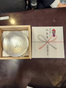 ご丁寧なお祝いの言葉と立派な記念品をT様に渡されました。