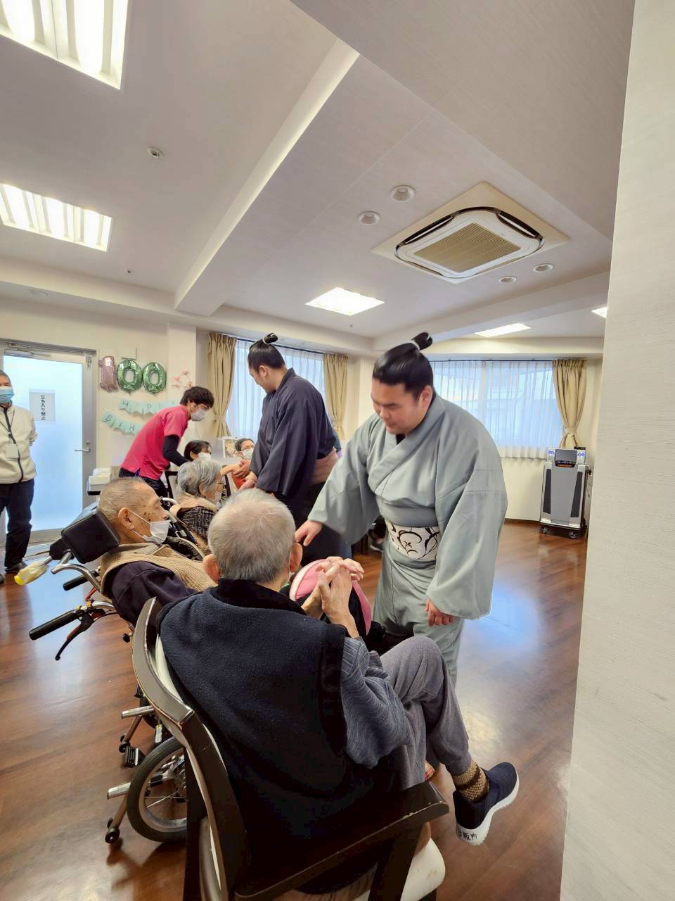今日は東住吉区今川の福祉会館を宿舎としている放駒部屋の若手お相撲さん3人が施設に来られました。