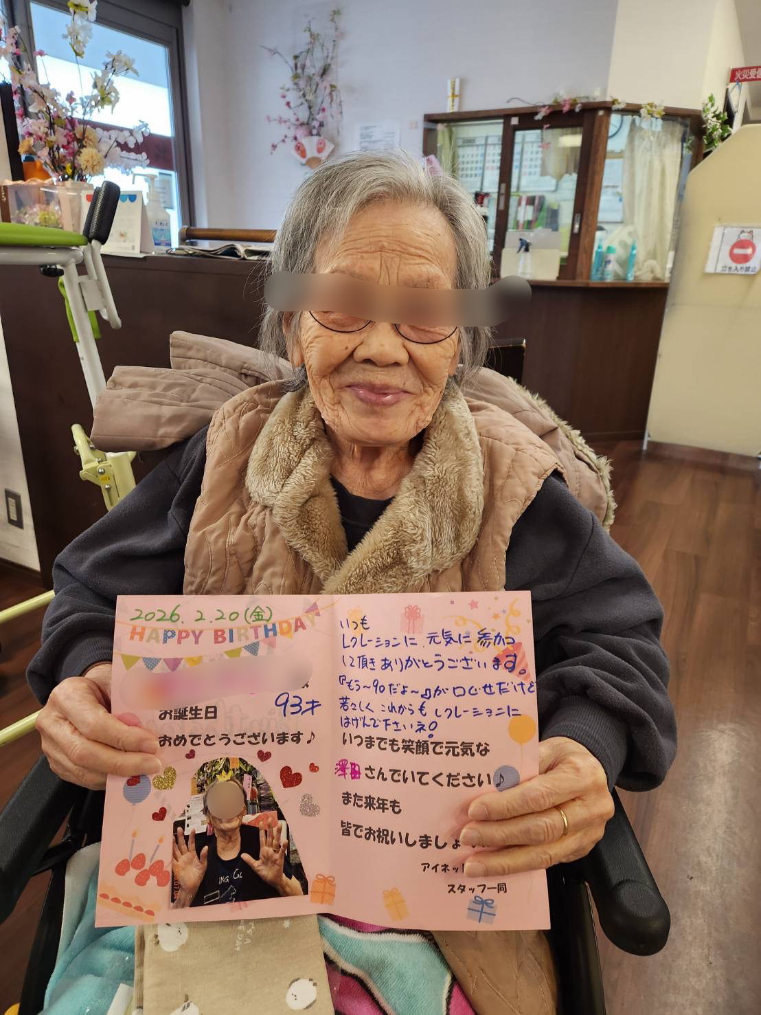 お誕生日 2026.2.20 今日は〇〇様のお誕生日のお祝いをしました。 おめでとうございますっ! 「もう90だよー」が口癖S 様、、、、 もう93歳になられたんですね(^^; これからも元気でレクリエーション頑張って盛り上げてください\(^o^)/